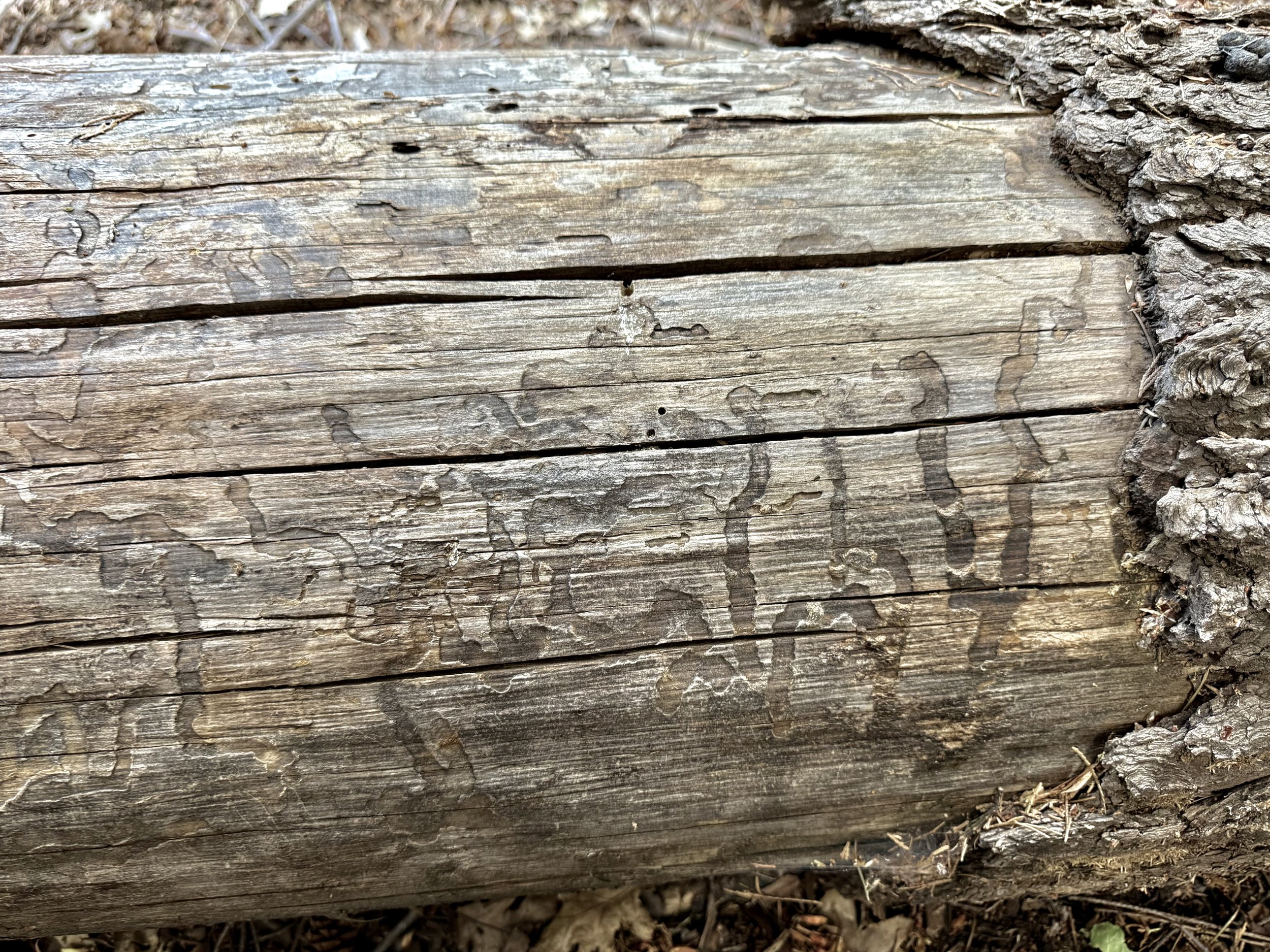 Because sunrise comes later each morning, I now wait until 7:45 for my morning explorations around the grounds with our cat Peekay. I have no interest in running into a black bear looking for blackberries in the woods or a fox still out on the prowl. Once the school bus has picked up the neighborhood children, Peekay and I slip outdoors into cool morning air. Along the edge of our property line he stops to investigate a log that appears to be covered with hieroglyphics etched by insects. When we finally return to the deck and he is in his Catio, a praying mantis keeps him occupied until a frog steals his attention.
